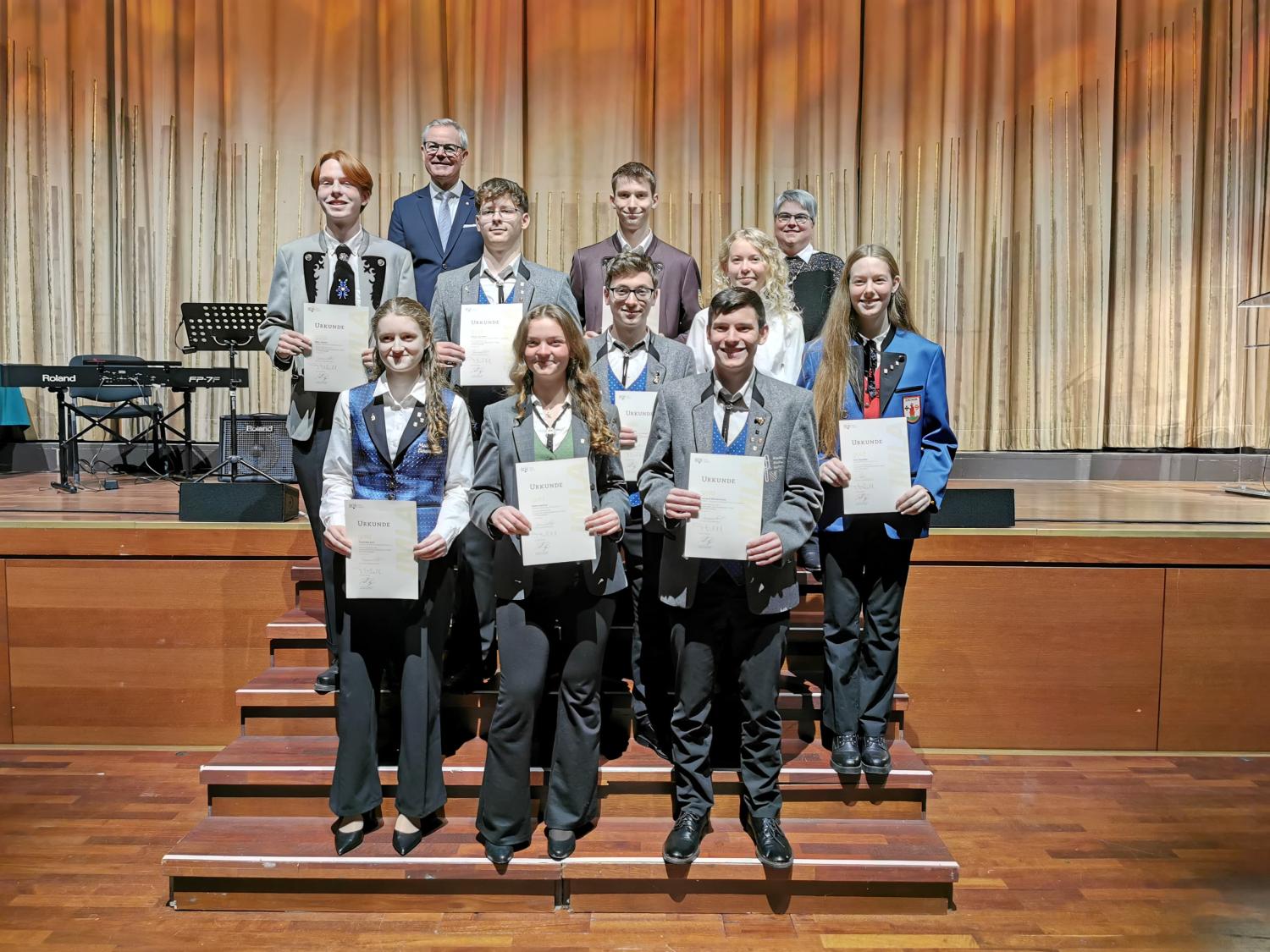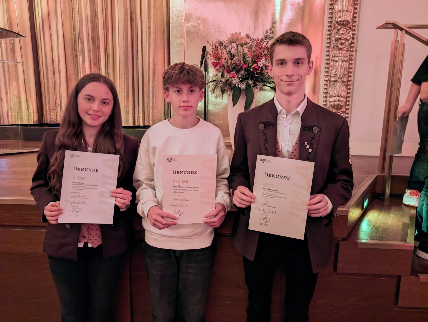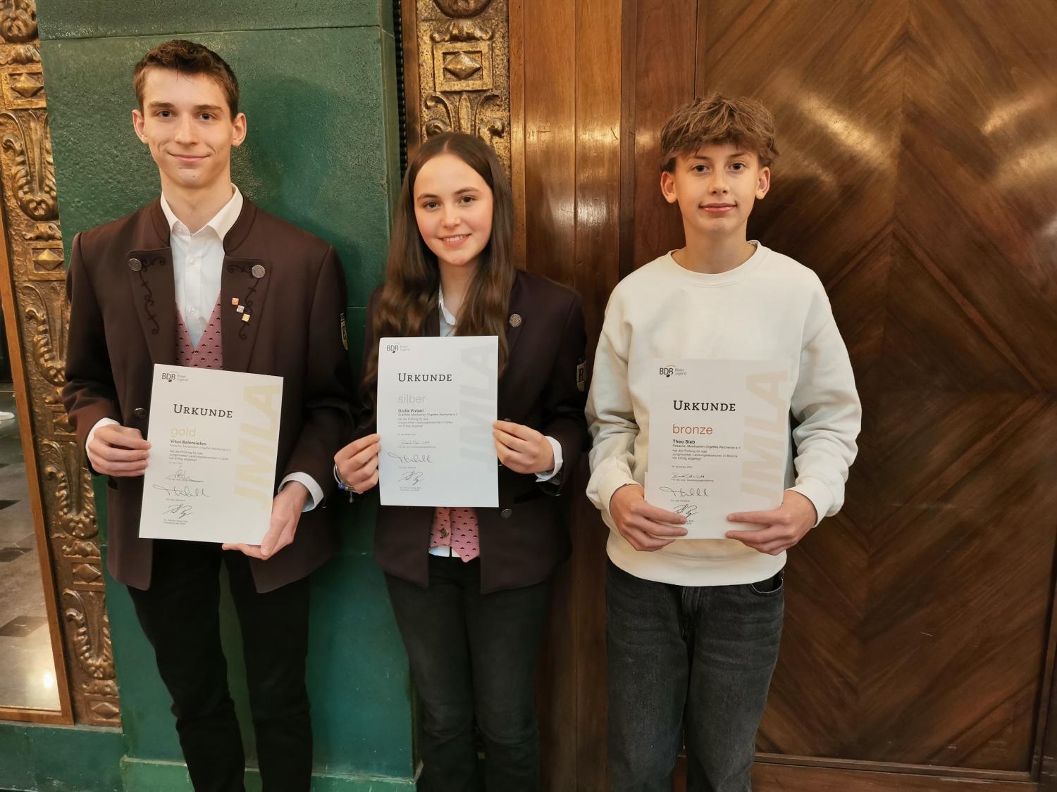 Theo Sieb (Posaune) konnte ein JMLA in Bronze entgegennehmen, und Giulia Viviani (Querflöte) freute sich über ihre silberne JMLA-Nadel. Um das Triple perfekt zu machen, durfte Vitus Balensiefen (Posaune) die höchste Auszeichnung entgegennehmen, die der BDB zu vergeben hat – nämlich das JMLA in Gold. Für diese Auszeichnung hatte er im April eine „Prüfungswoche“ an der BDB-Musikakademie in Staufen erfolgreich absolviert.