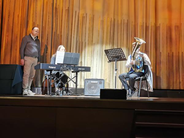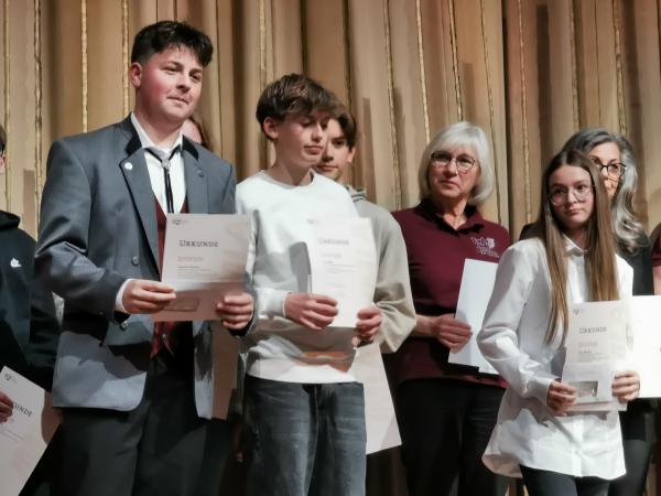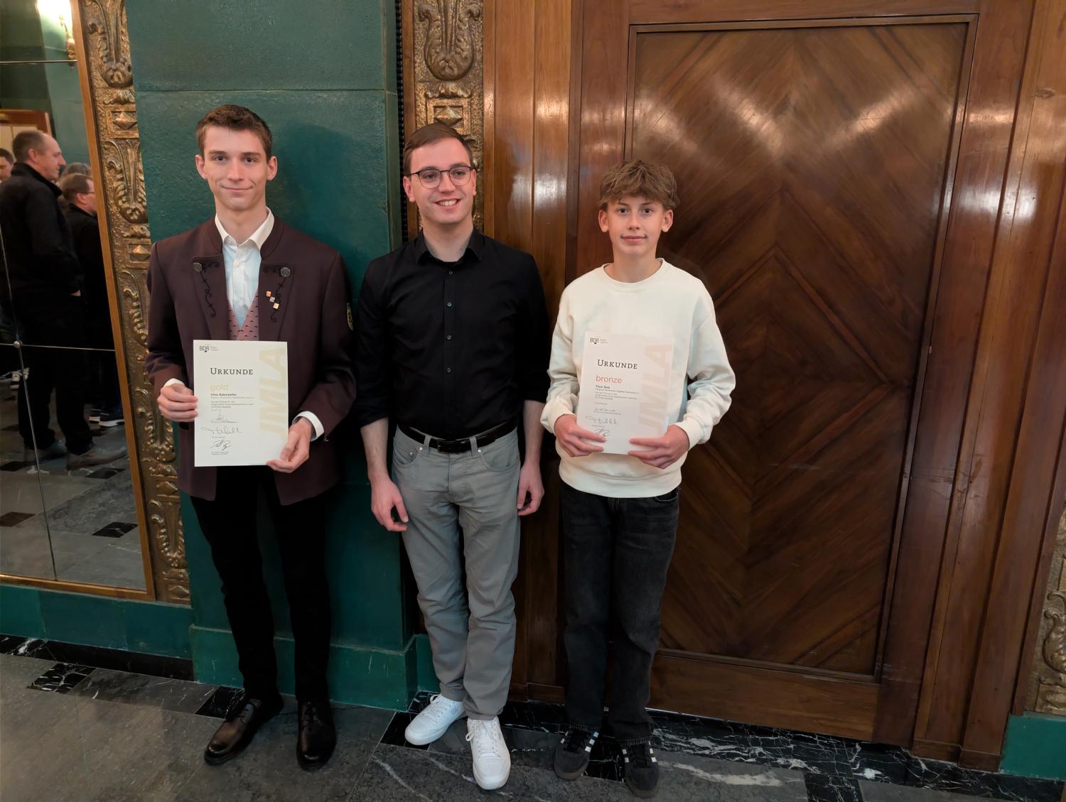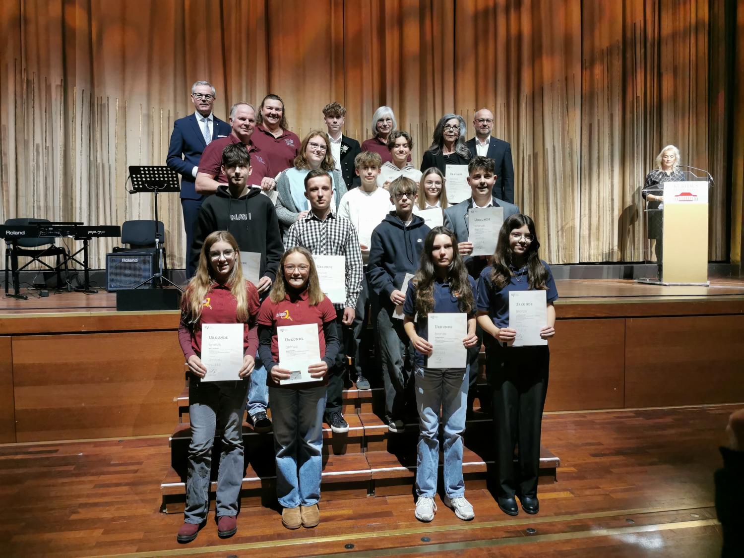 Theo Sieb (Posaune) konnte ein JMLA in Bronze entgegennehmen, und Giulia Viviani (Querflöte) freute sich über ihre silberne JMLA-Nadel. Um das Triple perfekt zu machen, durfte Vitus Balensiefen (Posaune) die höchste Auszeichnung entgegennehmen, die der BDB zu vergeben hat – nämlich das JMLA in Gold. Für diese Auszeichnung hatte er im April eine „Prüfungswoche“ an der BDB-Musikakademie in Staufen erfolgreich absolviert.